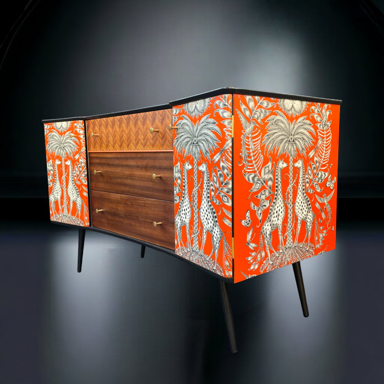 Turnidge of London sideboard, Gatsby, decoupage, glass doors, brass feet, 1960s, upcycled, sustainable living, eco furniture, dining room.